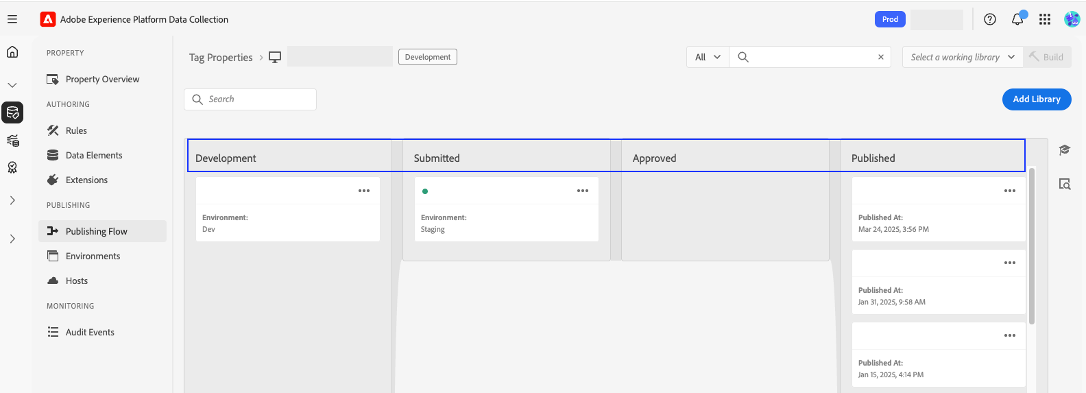 Contrairement à d’autres TMS qui ont un fonctionnement avec “preview + publication” ou 3 états “dév / preprod / prod”, Adobe Launch propose 4 étapes dans le workflow de publication :