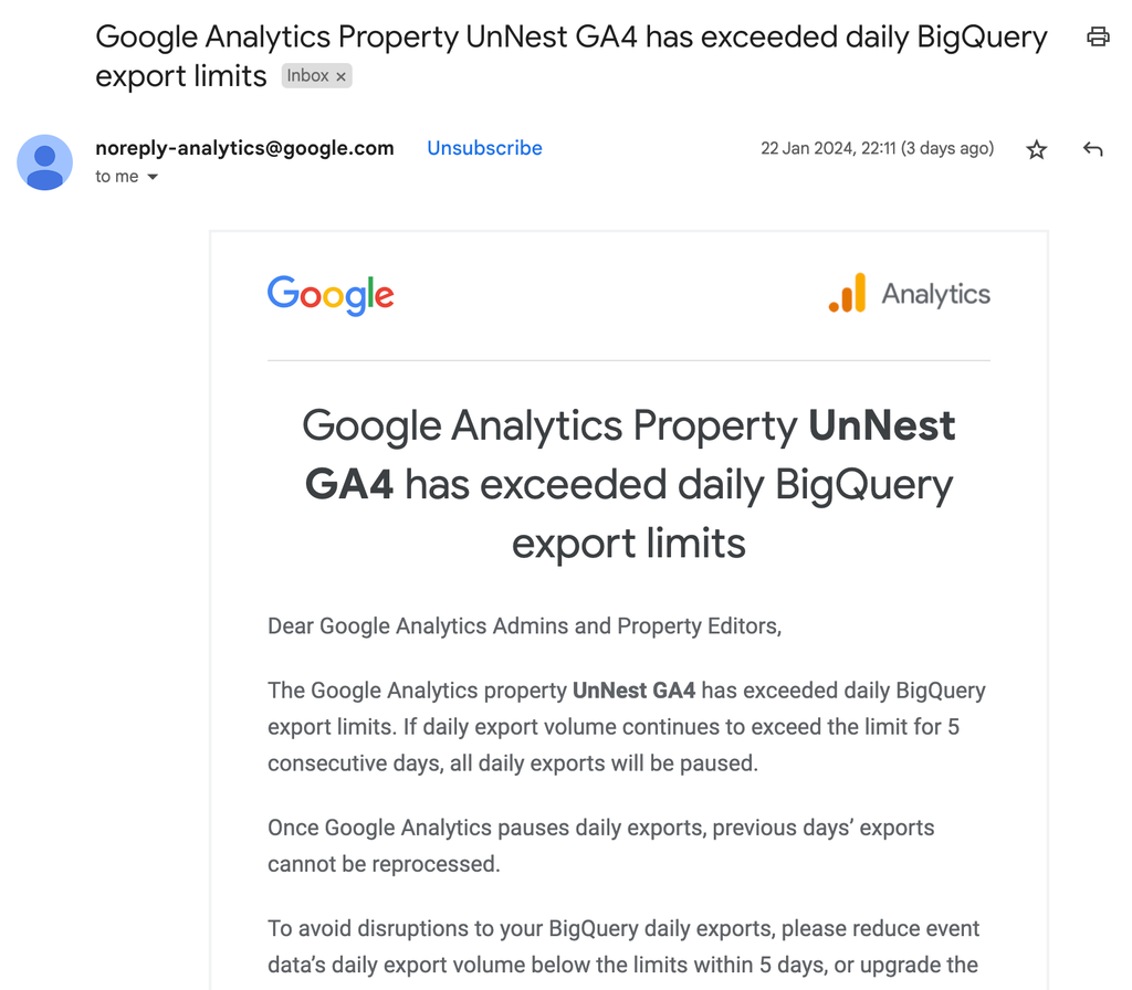 Ça y est notre blog a atteint le million de hits journaliers !! (ça c’est grâce du dernier article de Vincent Lahaye sur consent mode V2). Mais notre enthousiasme est retombé quand on a reçu cet email de la part de Google. Impossible pour UnNest de passer à GA 360 en quelques jours (même tout court..). Mais heureusement, on a trouvé quelques astuces pour contourner le problème et on vous les partage dans cet article.