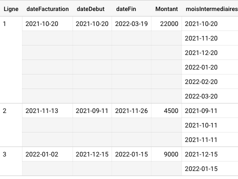 sqltable_montant_date AS ( SELECT Montant as Montant, dateDebut as dateDebut, dateFin as dateFin FROM `VOTRE TABLE` -- Renseignement de la table contenant les données à traiter -- Si désiré, renommer et convertir les colonnes dates & montant ici ),