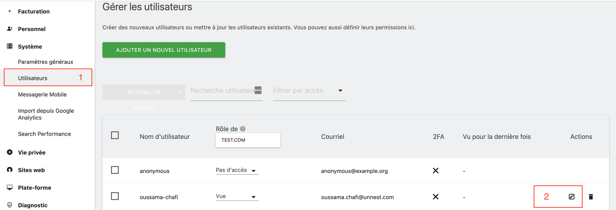- Cliquer sur l’icône de modification pour modifier les accès à l’un des utilisateurs [2].